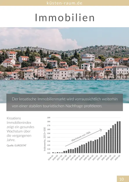In einem Markt, der zunehmend von Investoren und Selbstnutzern geschätzt wird, bietet der Kauf einer Immobilie in Kroatien eine attraktive Gelegenheit, von der positiven Preisentwicklung zu profitieren. Die starke Preisdynamik, insbesondere in Küstenregionen, macht Kroatien zu einem attraktiven Ziel für diejenigen, die eine Wertanlage suchen oder von einem Leben am Meer träumen. Angesichts der weiterhin hohen Nachfrage und der begrenzten Verfügbarkeit von Neubauten und Luxusimmobilien in begehrten Lagen, scheint der Moment für einen Einstieg in den kroatischen Immobilienmarkt günstiger denn je.