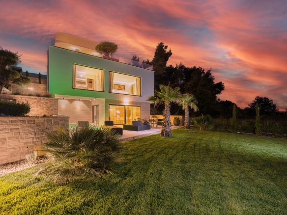 Auf jeder Etage in beiden Häusern befinden sich Balkone oder Terrassen mit sehr hochwertigen Loungemöbeln. Die bodentiefen Fenster überall sorgen für Licht, Luft und wunderschöne Ausblicke. Aus der vorderen Villa bietet sich von allen Etagen ein traumhafter Blick auf die Bucht von Vrsi. Sie verfügt über eine Wohnfläche von 172 m², die sich über drei Etagen erstrecken.